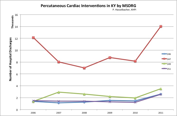 So it is that another Kentucky hospital is under the spotlight. We are told that plaintiff’s attorneys are recruiting cardiac patients from King’s Daughter Medical Center in Ashland. I have no specific knowledge that anything improper was done there, but based on my investigation of Kentucky utilization data, this would have been an obvious place to look. King’s Daughter is one of the top three hospitals in the state for the number of circulatory discharges. In 2008 when I analyzed the data, it was number one for the most common angioplasty stenting procedure (MSDRG 247) placing almost triple the number done at Jewish Hospital in Louisville! Angioplasty has become a growth industry for Kentucky.