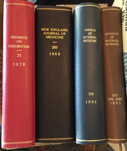 They were once one of my most prized possessions, but now I can’t even give them away. Beginning in 1967 with the New England Journal of Medicine (NEJM), I began to bind my medical journals. The fact that the practice was begun for me by my late father-in-law only increased my emotional attachment to these physically and intellectually handsome books. As my career progressed, I added all the major general internal medicine and rheumatology journals to my collection. I was on the editorial board of two of these, wrote articles appearing in them, and reviewed countless articles submitted for publication by others. I carried these books from one institution to another for over 40 years until, following my active medical retirement, they ended up in a Stor-All facility. As I attempt to further downsize now because I no longer physically have room for them, I discover to my naive surprise and disappointment that no one else wants them. My current dilemma stems from the fact that I cannot bring myself to throw them away. Perhaps one of my readers can help me. Details about the collection can be found at the end of this article.