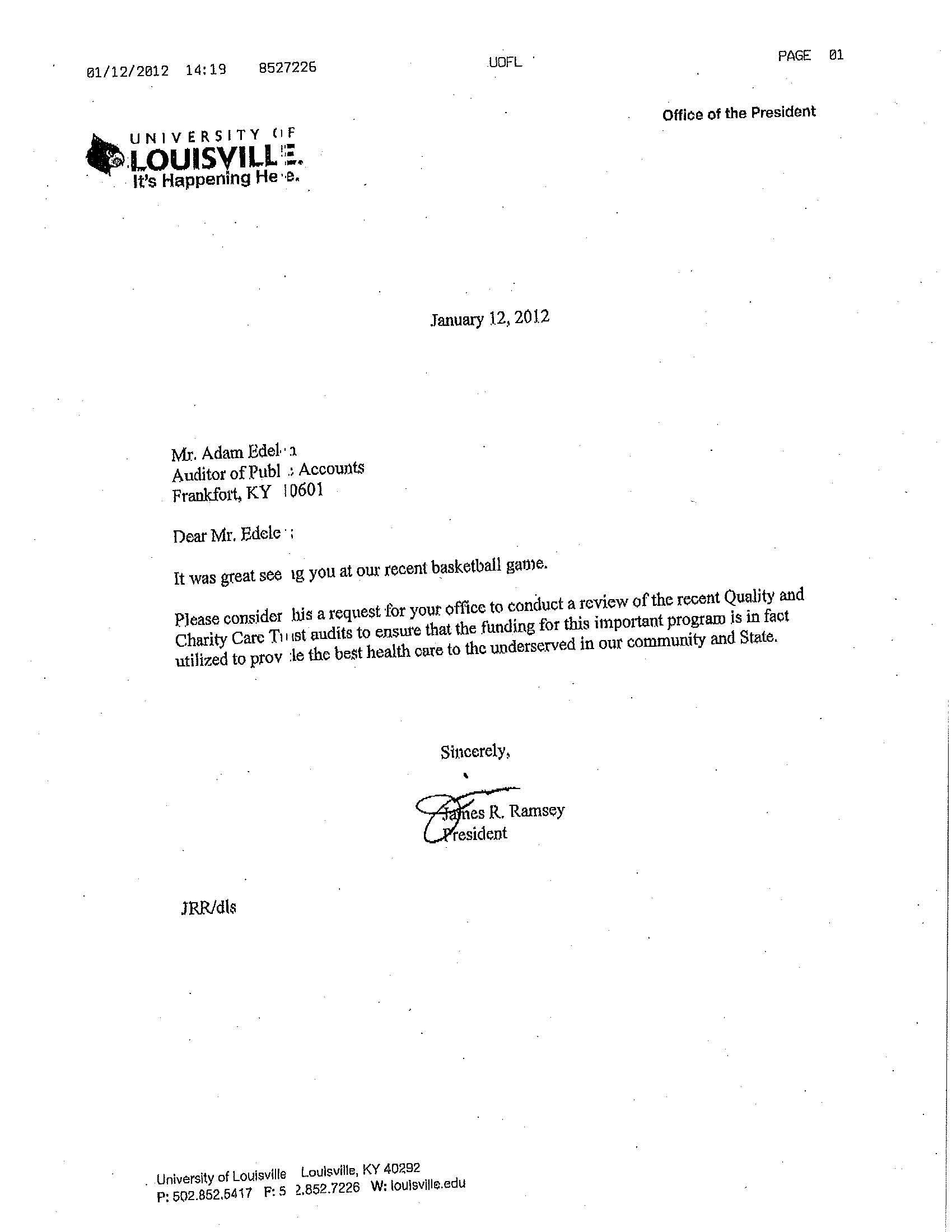 I was able to obtain a copy of the communication sent by UofL President James Ramsey to State Auditor Adam Edelen that the University believes initiated the Auditor’s review of the University’s use of the QCCT supporting indigent care at University Hospital. Some of us believe that this audit was inevitable and that the University simply wanted to put their best face on a potentially threatening situation. Why stand in front of a freight train? [Of course, this analogy seems not to work with respect to the University’s claims that its Hospital, various boards, foundations, and other units are private!] Here follows the text of the facsimile sent to Frankfort.